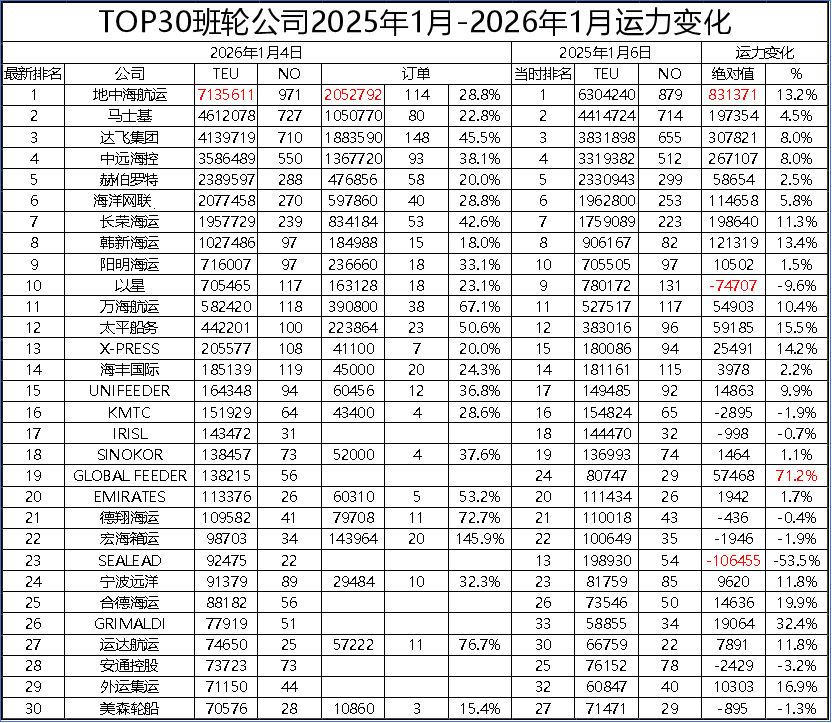 Over the past year, the combined capacity of the top 30 global shipping lines increased by 2.197 million TEU, representing a 7.5% growth rate and capturing 97.8% of the total global capacity expansion during this period. MSC led all carriers with an increase of 831,000 TEU, marking a 13.2% growth rate, while CMA CGM followed closely with a capacity gain of 308,000 TEU. In terms of growth percentages, GLOBAL FEEDER topped the list with an impressive 71.2% increase, with GRIMALDI, Heung-A Shipping, Sinotrans Container Lines, and Pacific International Lines also recording growth rates exceeding 15%. Notably, Hai Ling Shipping experienced a significant capacity reduction of 106,000 TEU year-over-year, while ZIM Integrated Shipping Services also saw a decrease of 75,000 TEU.